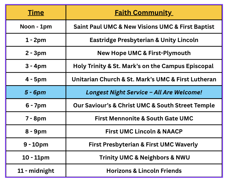 Join us on the longest night of the year for a 12-hour outdoor prayer vigil, as we stand together in hope, solidarity, and reflection. From 12:00 PM to 12:00 AM, faith communities of Justice in Action will each take responsibility for one hour of prayer and presence. Come during your congregation’s assigned hour—or stop by any time to participate. There will be a prayer 12 minutes after the hour, every hour. Each faith community can use the hour how they’d like! Consider bringing joy and light into this dark season - lead a song, bring warm drinks to share, and enjoy fellowship time.